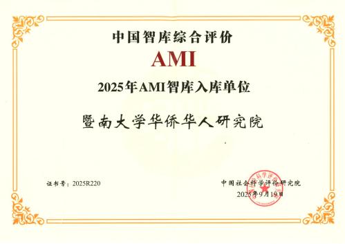 近日,中国社会科学评价研究院公布《中国智库综合评价研究项目2025年AMI智库入库名单》《中国智库综合评价研究项目2025年中国智库特色案例名单》,暨南大学华侨华人研究院成功入选“中国智库综合评价研究项目(2025)AMI智库”。同时,部分学术成果还入选“中国特色新型智库建设十年回顾参考案例”。