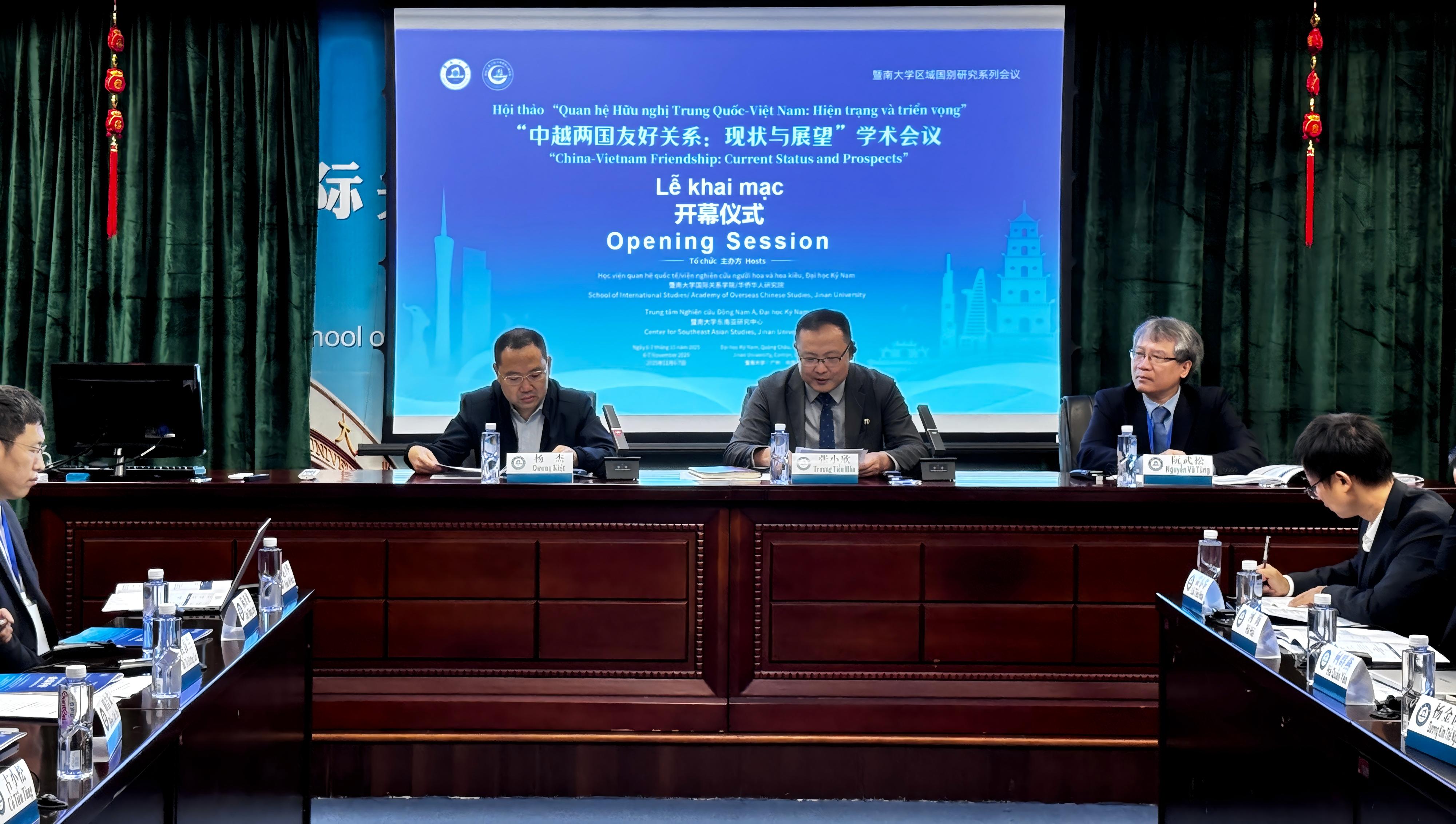 暨南大学副校长张小欣在开幕致辞中介绍了暨南大学在区域国别研究和华侨华人研究方面的办学传统与学科优势,他指出,本次研讨会旨在以学术交流服务国家总体外交,推动中越关系在建交75周年和“中越人文交流年”之际继续走深走实。越南外交学院原院长、前驻韩国大使、前驻美大使馆公使和使团副团长阮武松在致辞中强调,中国是越南最重要的全面战略伙伴,中越双方应当在“四好”精神和“十六字”方针指引下,通过学术交流与政策对话,在新的国际形势下巩固政治互信、拓展务实合作。
