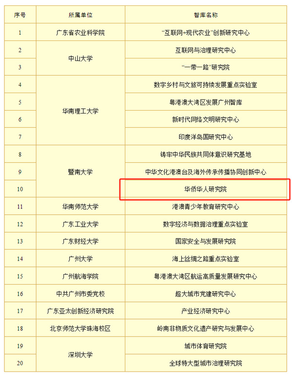 近日,广东省社会科学界联合会正式发布了《省社科联关于社科新型智库评审结果的通报》,本次评审综合考虑各新型智库的建设基础、成果贡献、社会影响力及与广东省社科联的合作情况,共评定高端智库10家、重点智库20家。暨南大学华侨华人研究院成功获评广东省社会科学新型重点智库。